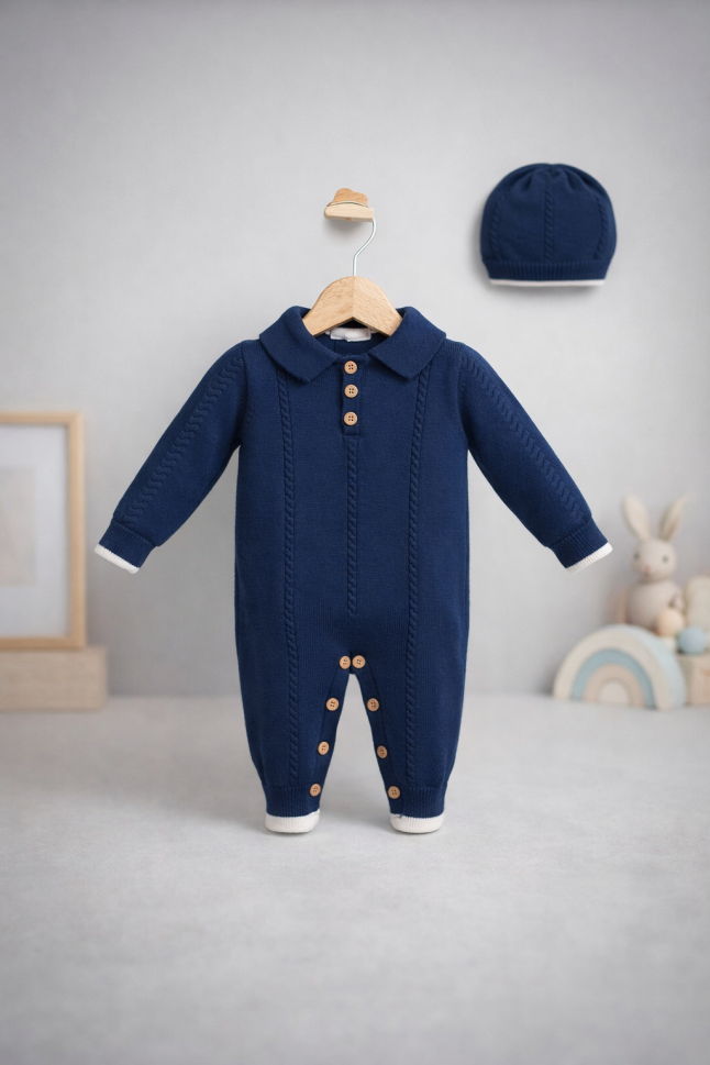 Imbraca-ti micutul cu dragoste si confort in acest set tricotat adorabil, perfect pentru primele luni de viata! Setul include o salopeta moale si o caciula asortata, ambele create cu grija din materiale de inalta calitate, pentru a proteja pielea sensibila a bebelusului.