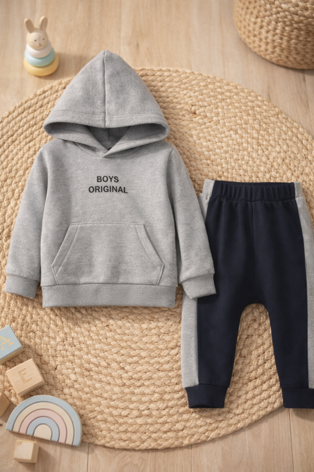 Setul include un hanorac confortabil și o pereche de pantaloni asortați, perfecte pentru joacă sau pentru o zi relaxantă acasă. Designul simplu și modern se potrivește oricărei ocazii, iar materialul moale asigură libertate de mișcare pentru bebelușul dumneavoastră.