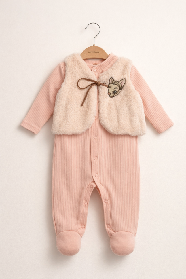 Setul nostru are un design simplu, dar adorabil, perfect pentru a-l face pe bebelușul tău să arate minunat. Salopeta este disponibilă în diferite culori și modele, iar vesta de pluș adaugă un plus de farmec și căldură.