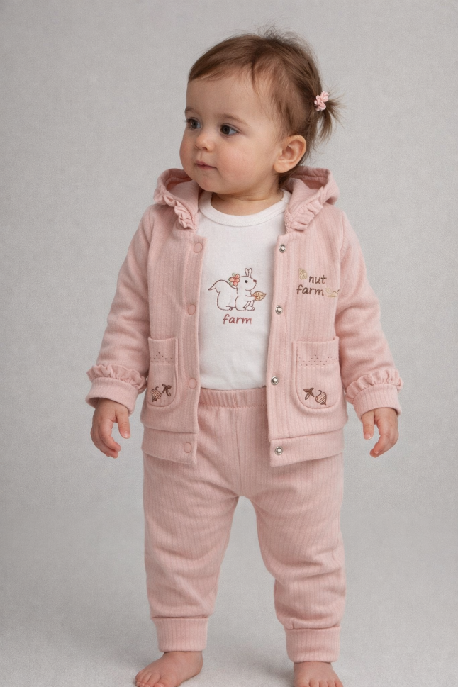 Descoperă setul perfect pentru bebelușul tău, ideal pentru zile pline de joacă și confort! Fabricat în Turcia din bumbac 100%, acest set include un cardigan adorabil, un body practic cu nasturi și pantaloni lejeri.