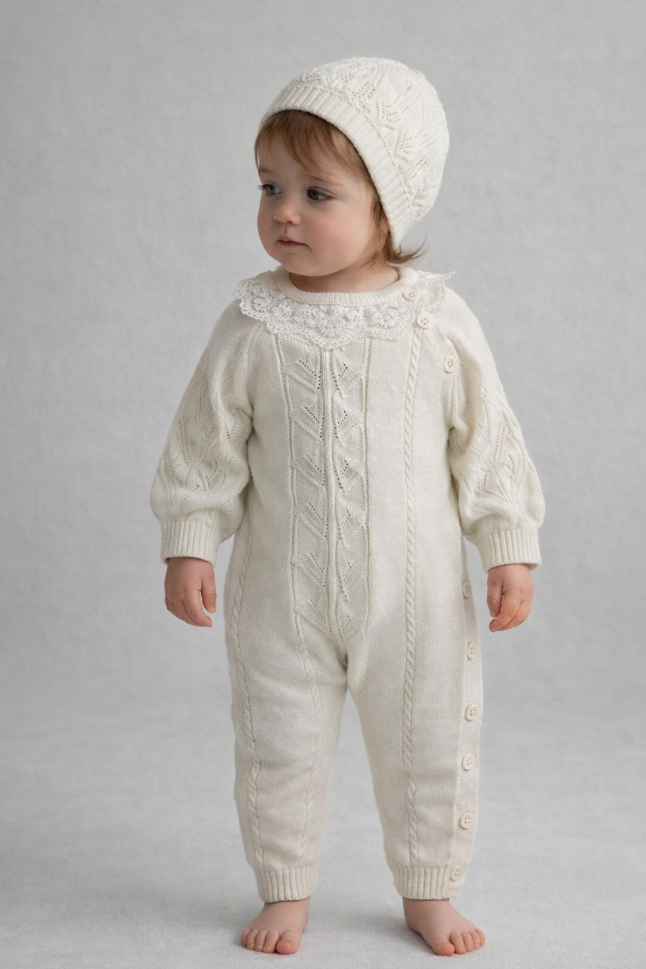 Setul include o salopetă tricotată și o căciulă asortată, perfecte pentru a menține bebelușul confortabil și călduros în orice moment. Designul este gândit pentru a fi ușor de îmbrăcat și dezbrăcat, facilitând schimbările rapide și comode.