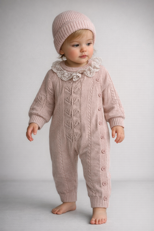 Setul include o salopetă tricotată și o căciulă asortată, perfecte pentru a menține bebelușul confortabil și călduros în orice moment. Designul este gândit pentru a fi ușor de îmbrăcat și dezbrăcat, facilitând schimbările rapide și comode.