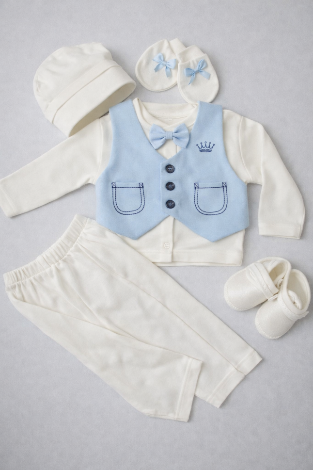 Acest set adorabil pentru bebeluși, mărimea 0-3 luni, este perfect pentru pielea sensibilă a nou-născutului. Fabricat în Turcia, setul include un maiou, pantaloni, mănuși, botine și o pălărie asortată.