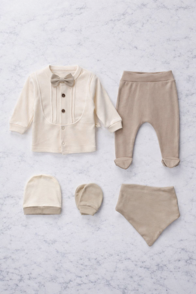 Setul include tot ce are nevoie micuțul tău: body, pantaloni, bavetă, căciulă și mănuși, toate realizate dintr-un material tip fagure de bumbac, moale și respirabil.