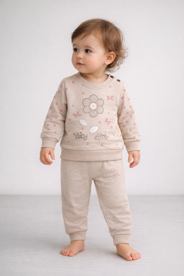 Descoperă setul perfect pentru micuțul tău! Acest set adorabil, compus dintr-un hanorac confortabil și pantaloni asortați, este ideal pentru bebelușii cu vârsta cuprinsă între 9 și 24 de luni. Fabricat din bumbac de calitate superioară, setul este delicat cu pielea sensibilă a bebelușului și nu conține substanțe cancerigene sau alergene, oferind siguranță și confort maxim.