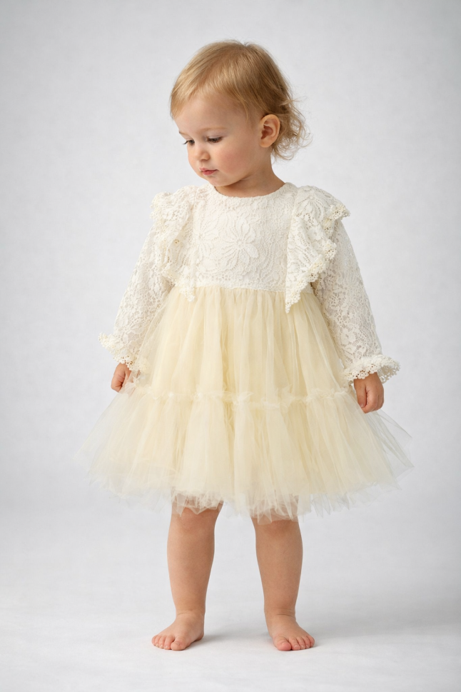Caracteristici Principale: * Material: Poliester de înaltă calitate, non-alergenic. * Design: Rochie cu dantelă și tul, ideală pentru ocazii speciale. * Siguranță: Nu conține substanțe cancerigene. * Întreținere: Se spală la mașină la 30°C. * Mărimi disponibile: 1, 2, 3, 4, 5 ani. * Fabricat în: Turcia.