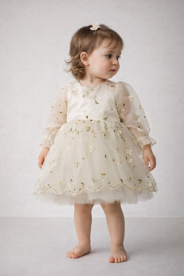 Această rochiță deosebită se remarcă prin dantela fină și tulul delicat, care adaugă un plus de eleganță și farmec. Micuța ta va arăta absolut adorabil la orice ocazie specială!