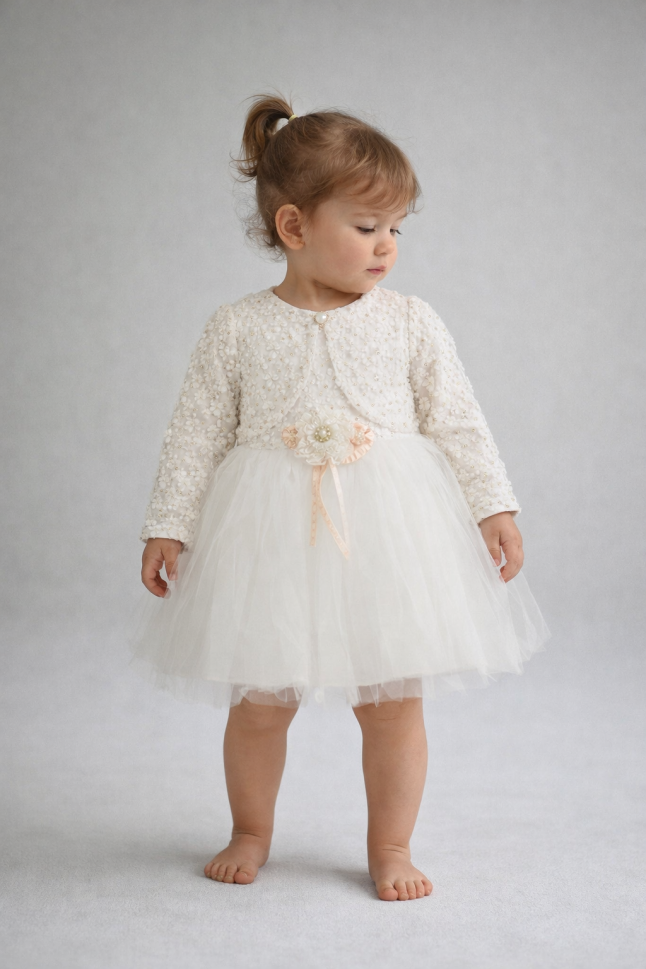 Îmbracă-ți fetița în eleganță și rafinament cu această rochiță încântătoare, perfectă pentru ocazii speciale sau pentru a adăuga un strop de magie zilelor obișnuite. Setul include o rochiță adorabilă cu tul și un bolero asortat, creând o ținută completă și stilată.