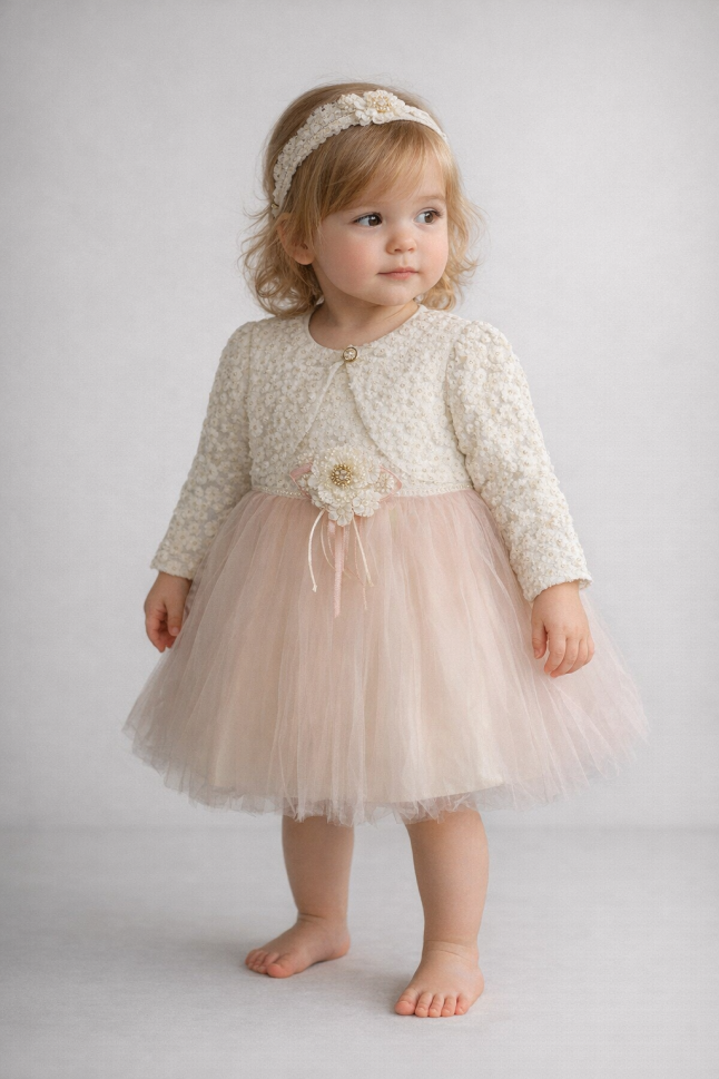 Îmbracă-ți fetița în eleganță și rafinament cu această rochiță încântătoare, perfectă pentru ocazii speciale sau pentru a adăuga un strop de magie zilelor obișnuite. Setul include o rochiță adorabilă cu tul și un bolero asortat, creând o ținută completă și stilată.