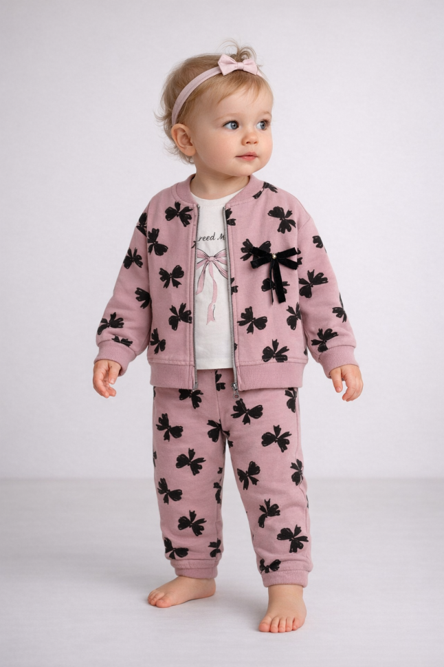 Setul include o jachetă călduroasă, o bluză moale și pantaloni comozi, oferind un look adorabil și practic.