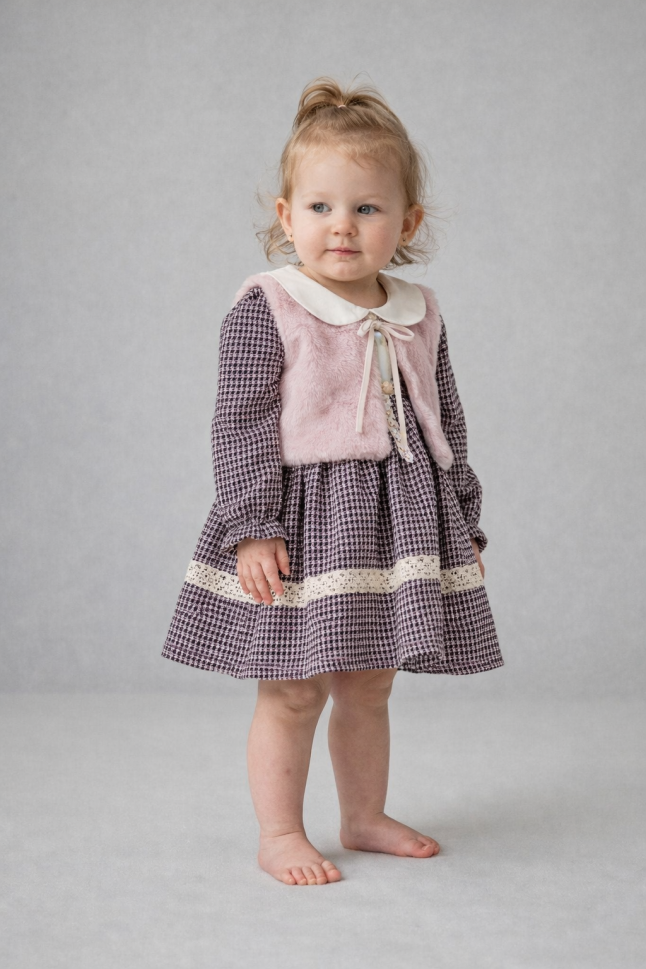 Introduceți o notă de căldură și stil în garderoba micuței dumneavoastră cu acest set adorabil, perfect pentru zilele răcoroase! Setul include o jachetă de pluș moale și confortabilă și o rochie chic, creând o combinație încântătoare pentru orice ocazie.
