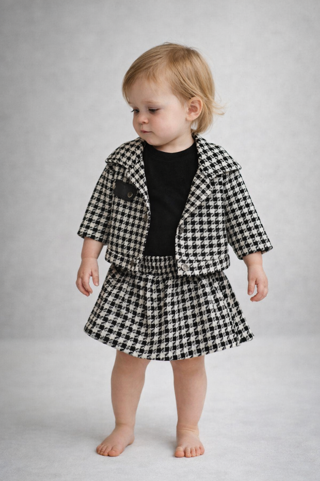 Descoperă setul perfect pentru micuța ta fashionistă, un ansamblu adorabil și confortabil, ideal pentru zilele pline de joacă și aventură! Fabricat cu dragoste și atenție în Turcia, acest set este compus din trei piese esențiale: un body din bumbac moale, o fustă cochetă și o jachetă stilată.
