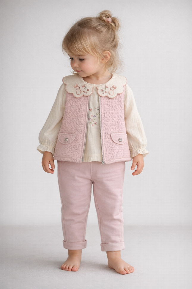 Setul include un hanorac moale din bumbac, perfect pentru zilele răcoroase, și pantaloni confortabili, care permit libertate de mișcare. În plus, un cardigan adorabil completează ținuta, oferind un plus de căldură și stil.