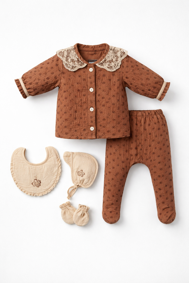 Alege acest set minunat din muselină și oferă-i bebelușului tău un start plin de confort și siguranță! Fabricat cu dragoste în Turcia.