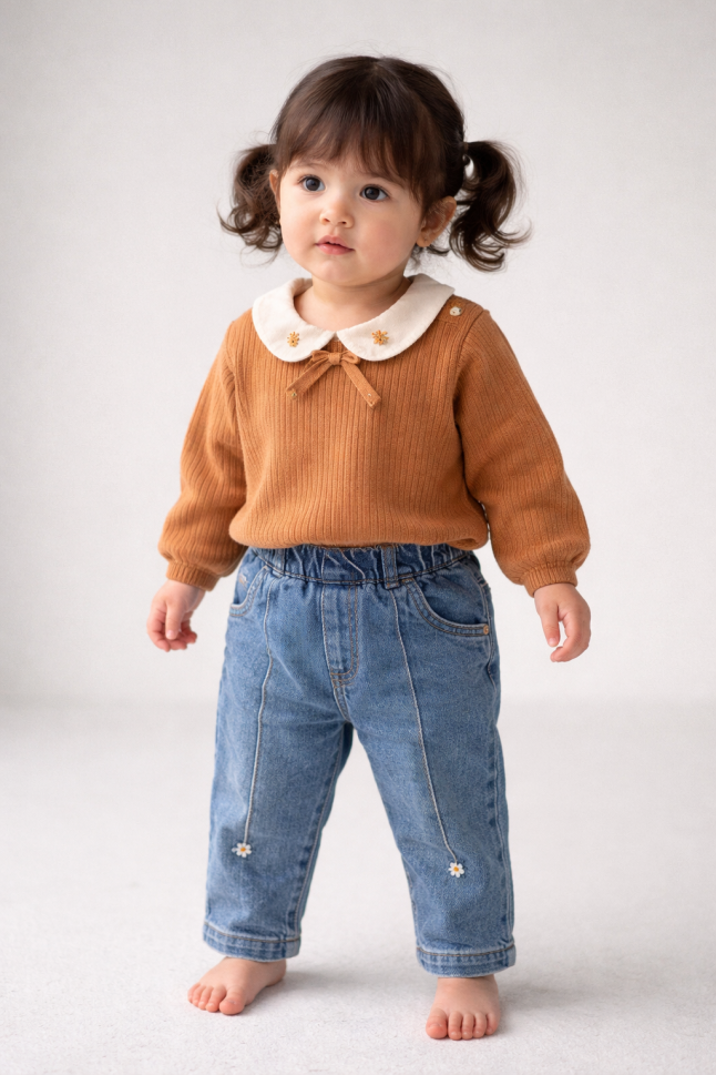 * Pantaloni: Pantaloni elastici și practici, ușor de îmbrăcat și dezbrăcat, ideali pentru joacă și explorare.