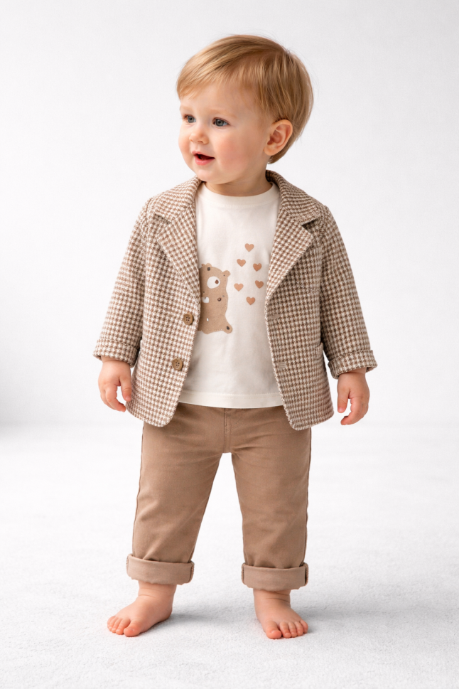 Descoperă setul perfect pentru micuțul tău, ideal pentru zile pline de joacă și confort! Fabricat cu dragoste în Turcia, acest set include o cămașă adorabilă, pantaloni lejeri și o jachetă chic, toate create din bumbac 100%, moale și delicat cu pielea sensibilă a bebelușului.