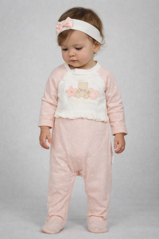 Fabricat în Turcia, setul include o salopetă practică și o cataramă asortată, ambele realizate din material jersey moale și plăcut la atingere. Ușor de întreținut, se spală la mașină la 30°C.- Vârsta: 3-6-9 luni