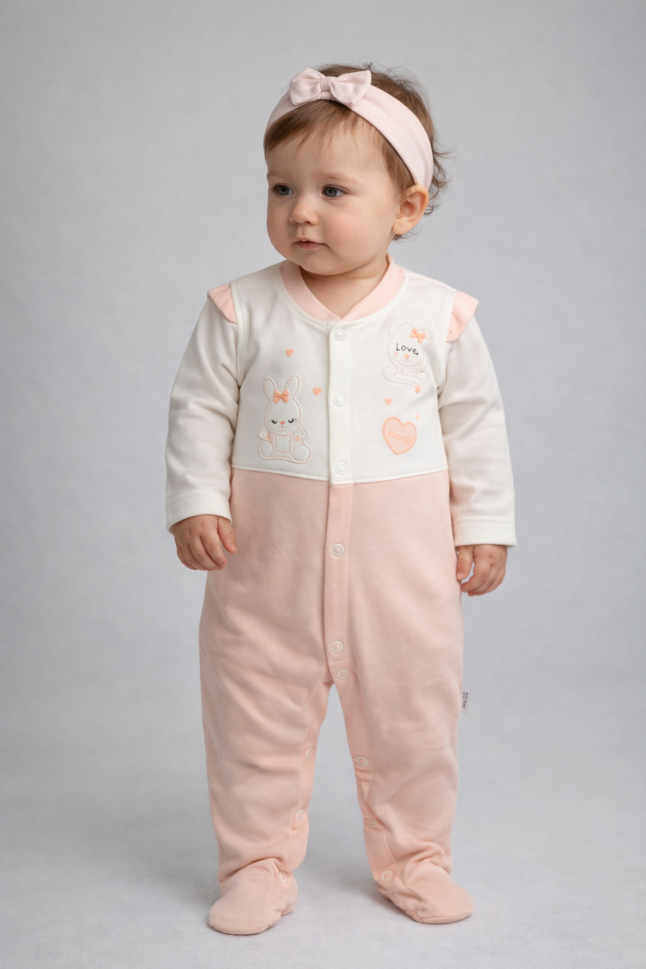 Fabricat în Turcia, setul include o salopetă practică și o cataramă asortată, ambele realizate din material jersey moale și plăcut la atingere. Ușor de întreținut, se spală la mașină la 30°C.