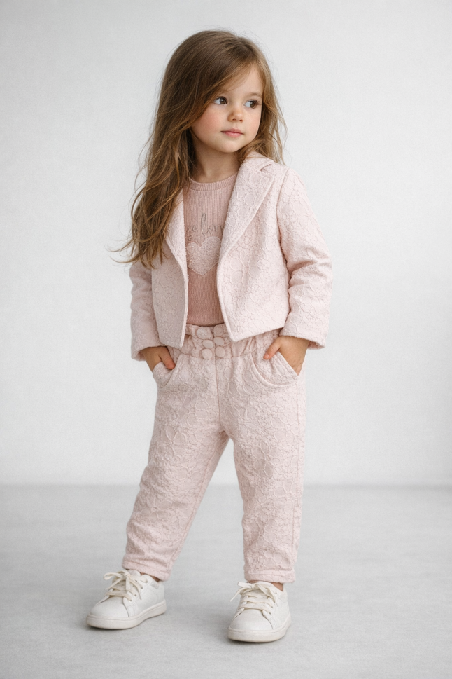 Descoperă setul perfect pentru micuțul tău! Fabricat cu grijă în Turcia, acest set include o jachetă, pantaloni și un body, toate create din bumbac 100%.