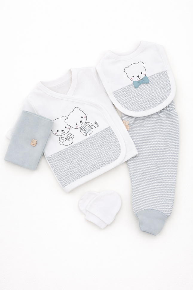 Îmbracă-ți micuțul cu delicatețe și confort cu acest set adorabil, perfect pentru primele luni de viață! Fabricat cu dragoste și atenție în Turcia, acest set complet asigură o atingere blândă asupra pielii sensibile a bebelușului tău.