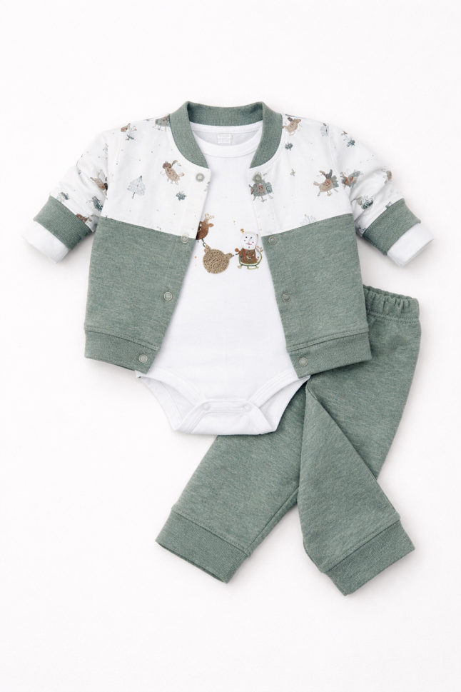 Setul include o jachetă adorabilă, un body practic cu nasturi și pantaloni confortabili, toate din material jersey moale.