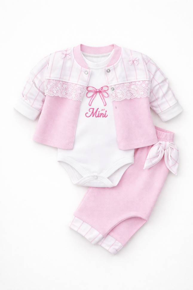Setul include o jachetă adorabilă, un body practic cu nasturi și pantaloni confortabili, toate din material jersey moale.