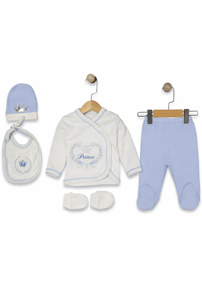 Setul include tot ce are nevoie micuțul tău: body, pantaloni, bavetă, căciulă și mănuși, toate realizate dintr-un material tip fagure de bumbac, moale și respirabil.