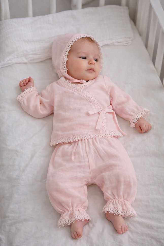 Setul include o bluză adorabilă cu închidere laterală, pantaloni confortabili cu elastic și o pălărie asortată. Designul simplu și elegant, accesorizat cu detalii delicate, va face din bebelușul tău o mică vedetă.