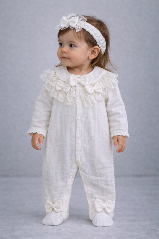 Beneficii: * Siguranță garantată: Fabricată din bumbac, fără substanțe nocive. * Confortabilă: Materialul moale din muselină este ideal pentru pielea delicată a bebelușilor. * Practică: Ușor de întreținut, se spală la mașină la 30°C. * Aspect deosebit: Design elegant cu guler din dantelă și clip de păr asortat.
