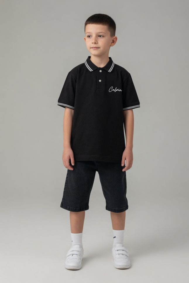 Set băieți format din tricou tip polo (lakos) și pantaloni scurți din denim, 100% bumbac. Potrivit pentru 7-10 ani, confortabil și elegant.