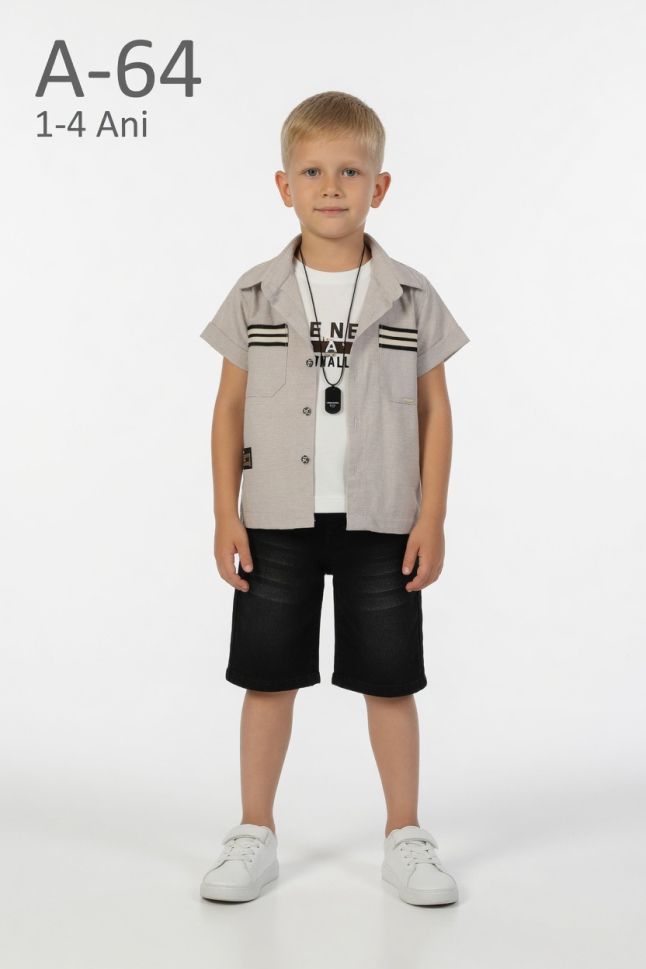 Setul pentru băieți din 4 piese, format din tricou, cămașă, colier și pantaloni scurți, oferă un look modern și confortabil. Fabricat din bumbac 100%, permite pielii să respire și este potrivit pentru pielea sensibilă. Materialul moale asigură confort pe tot parcursul zilei. Ideal pentru utilizare zilnică sau ținute mai elegante.