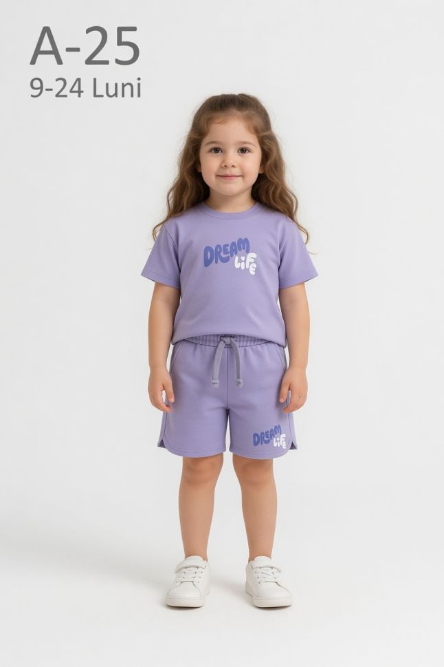 Setul pentru fetițe din două piese, format din tricou și pantaloni scurți, este ideal pentru sezonul cald. Fabricat din bumbac 100%, permite pielii să respire și este potrivit pentru pielea sensibilă. Materialul moale și ușor oferă confort pe tot parcursul zilei. Este o alegere practică și confortabilă pentru utilizarea zilnică.