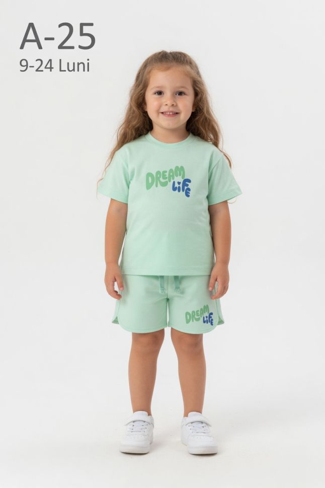 Setul pentru fetițe din două piese, format din tricou și pantaloni scurți, este ideal pentru sezonul cald. Fabricat din bumbac 100%, permite pielii să respire și este potrivit pentru pielea sensibilă. Materialul moale și ușor oferă confort pe tot parcursul zilei. Este o alegere practică și confortabilă pentru utilizarea zilnică.
