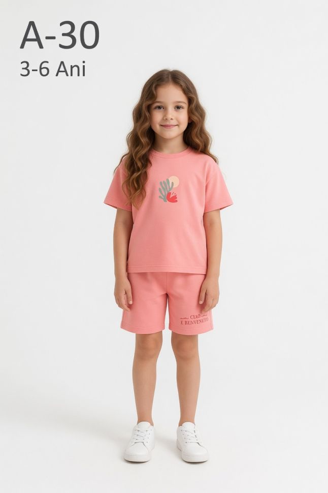 Acest set pentru fete din două piese este alegerea perfectă pentru sezonul cald, oferind un echilibru ideal între confort și stil. Setul este compus din tricou și pantaloni scurți, fiind potrivit pentru activitățile zilnice ale copiilor.