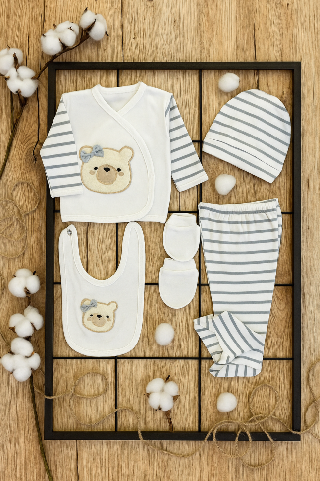 Îmbracă-ți bebelușul în confort și siguranță cu acest set adorabil de 5 piese, perfect pentru primele luni de viață! Fabricat cu dragoste și grijă în Turcia, acest set este alegerea ideală pentru pielea sensibilă a nou-născutului.