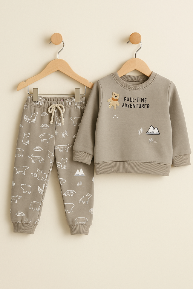 Setul include un hanorac călduros și o pereche de pantaloni lejeri, perfecti pentru joacă și relaxare. Designul este gândit pentru a oferi libertate de mișcare și un aspect simpatic, ideal pentru orice ocazie.