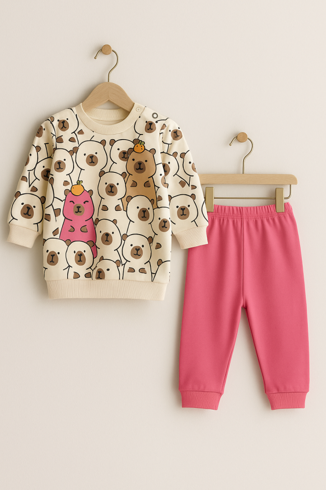 - Include un hanorac și pantaloni, perfecte pentru joacă sau plimbări.