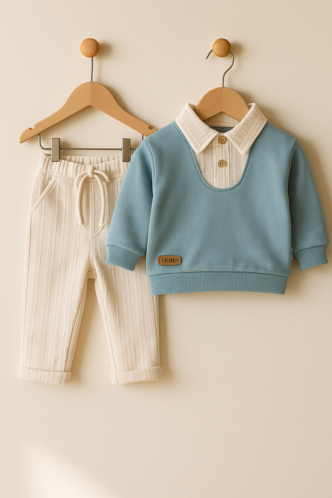 Descoperă setul perfect pentru micuțul tău! Acest set adorabil, compus dintr-un hanorac și pantaloni, este ideal pentru bebelușii cu vârste între 6 și 24 de luni. Fabricat în Turcia din bumbac 100%, garantează confortul și siguranța pielii sensibile a bebelușului tău.