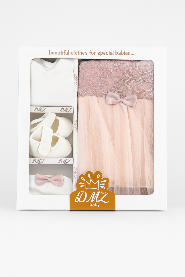 Set adorabil pentru bebeluși 0-3 luni, perfect pentru zile speciale sau ca un cadou minunat! Fabricat din bumbac fin, fără substanțe cancerigene sau alergene, asigurând confortul delicat al pielii bebelușului tău. Fabricat în Turcia, acest set include o rochiță, un body practic cu capse, o bentiță asortată și botoșei.