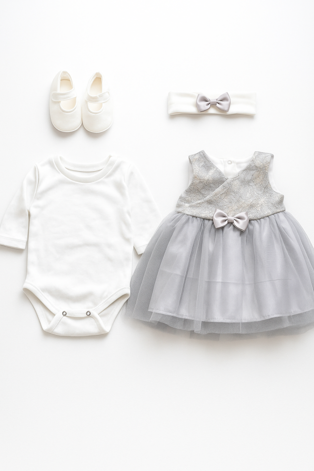 - Bandă pentru cap: Completează perfect ținuta, adăugând un plus de eleganță și stil. Banda este elastică și confortabilă, adaptându-se perfect capului micuței tale.