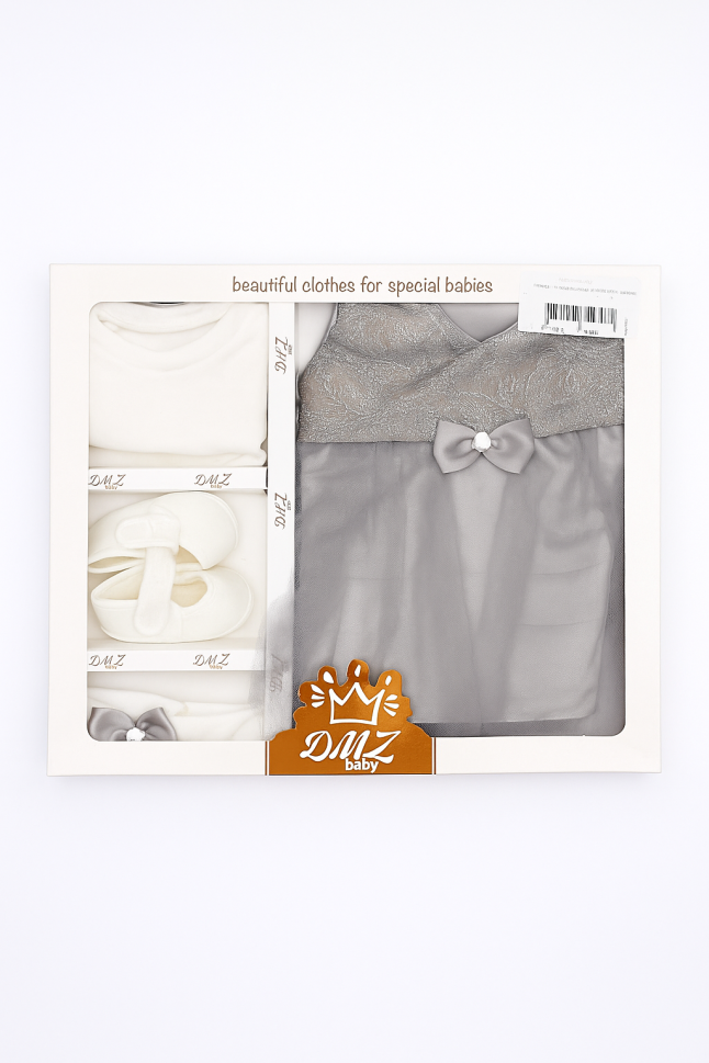 Set adorabil pentru bebeluși 0-3 luni, perfect pentru zile speciale sau ca un cadou minunat! Fabricat din bumbac fin, fără substanțe cancerigene sau alergene, asigurând confortul delicat al pielii bebelușului tău. Fabricat în Turcia, acest set include o rochiță, un body practic cu capse, o bentiță asortată și botoșei.