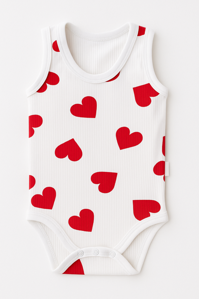 Îmbracă-ți micuțul cu dragoste și confort cu acest body adorabil, decorat cu inimioare roșii! Perfect pentru zilele călduroase sau ca strat de bază pe vreme mai rece, acest body este ideal pentru bebelușii cu vârste cuprinse între 0 și 9 luni.