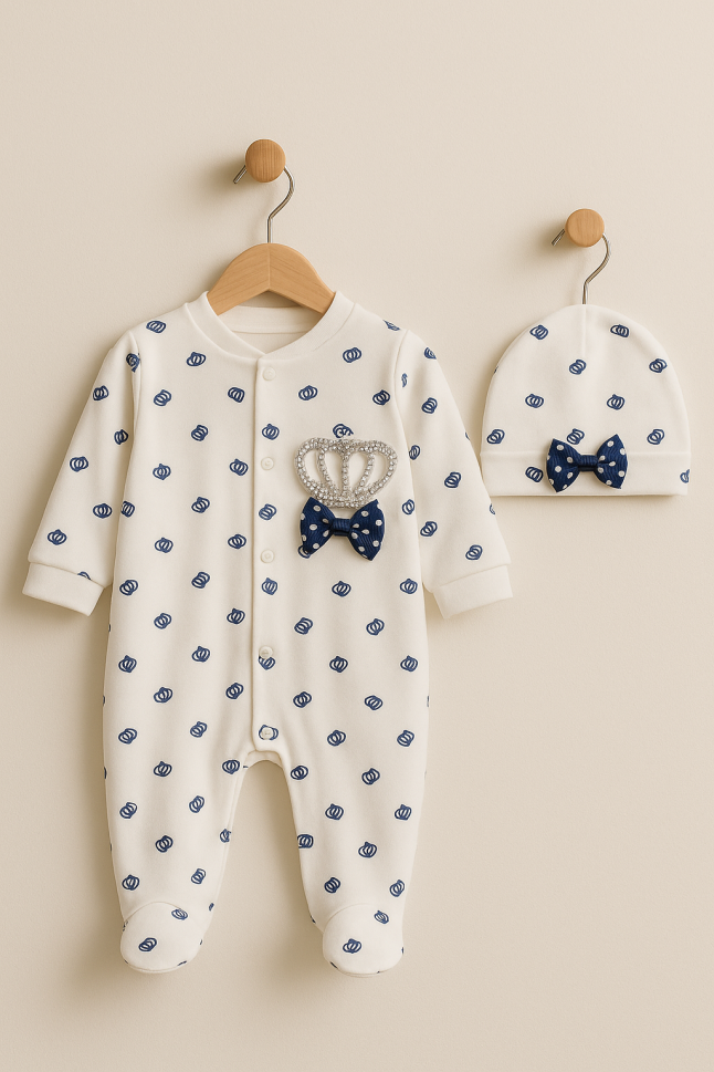 Setul include o salopetă confortabilă și o beretă asortată, perfecte pentru a-l menține pe micuț la căldură și stilat. Disponibil în dimensiuni pentru bebeluși de 0-3-6-9 luni, acest set este ideal pentru primele luni de viață ale bebelușului.