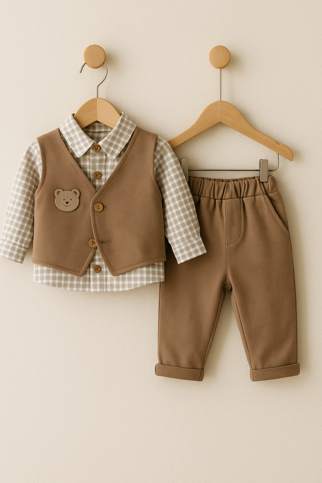 Setul include un hanorac, pantaloni și un cardigan asortat, oferind un look complet și stilat. Disponibil în mărimi pentru bebeluși de 3, 6, 9, 12 și 18 luni.