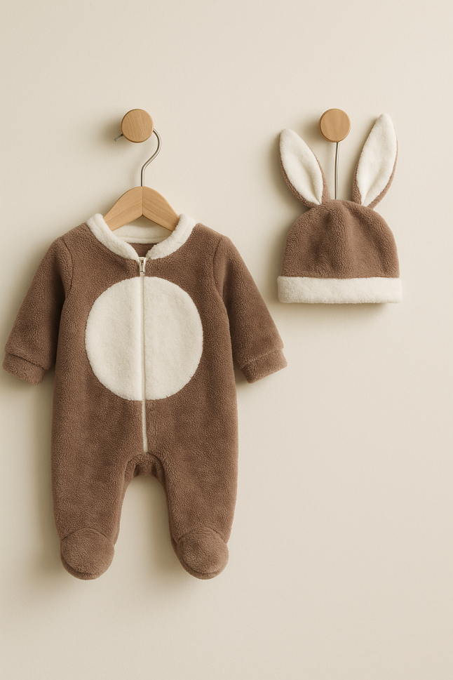 - Set complet: Include o salopetă călduroasă și o căciuliță asortată, pentru un look complet și adorabil.