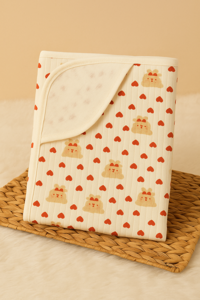 Pătură din bumbac pieptănat cu un singur strat, 85x75 cm, cu model de inimă și ursuleț de pluș A10