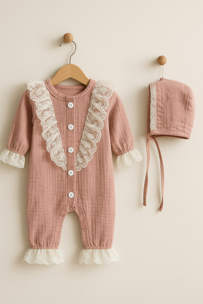 Acest set include o salopettă și o căciulă asortată, create special pentru pielea delicată a bebelușilor cu vârste cuprinse între 0 și 12 luni.