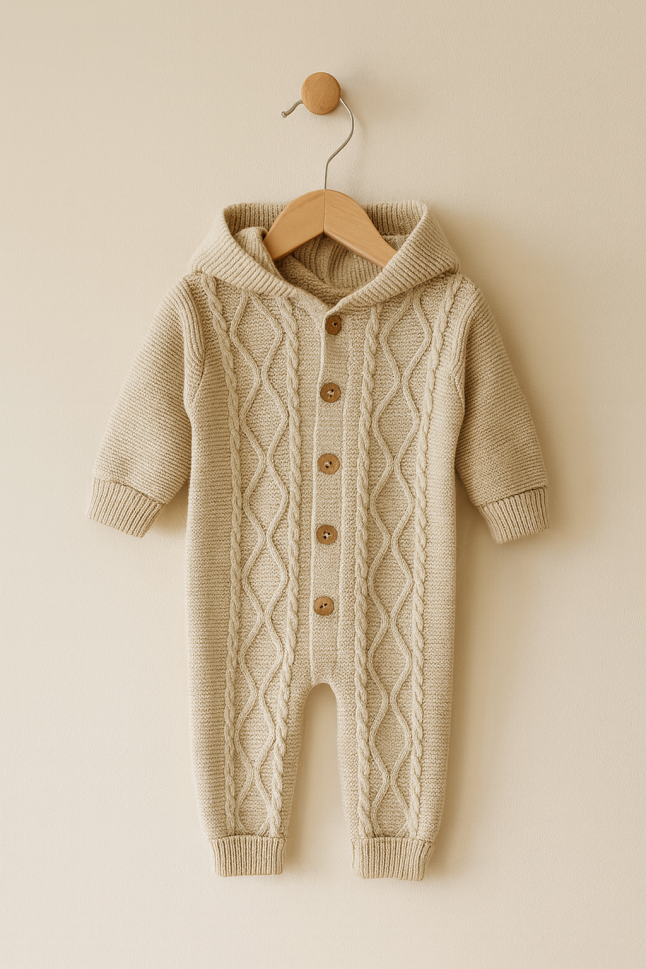 Îmbracă-l pe cel mic cu această adorabilă salopetă tricotată, perfectă pentru bebelușii de 6-12 luni!