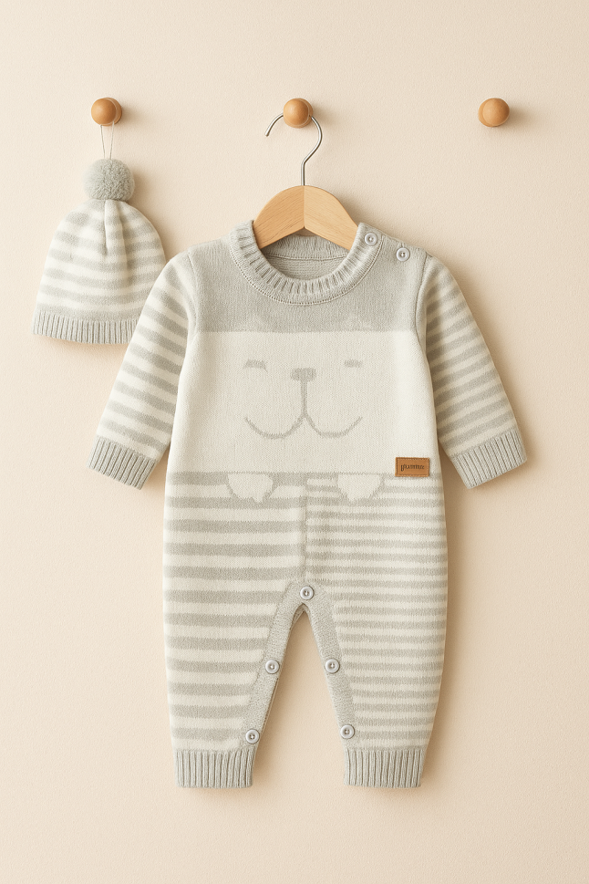 Îmbracă-ți micuțul cu dragoste și grijă cu acest set adorabil de salopetă și căciuliță tricotată, perfect pentru bebelușii cu vârsta cuprinsă între 6 și 12 luni! Fabricat cu atenție în Turcia, acest set combină confortul suprem cu siguranța și stilul.