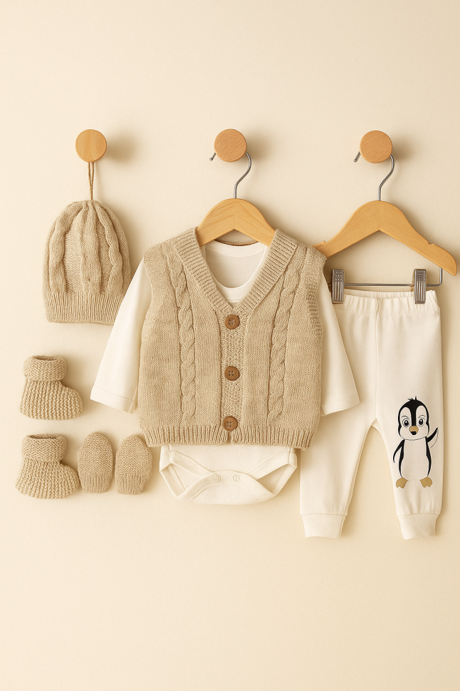 - Set Complet: Tot ce ai nevoie pentru a-ți îmbrăca bebelușul cu stil și căldură.